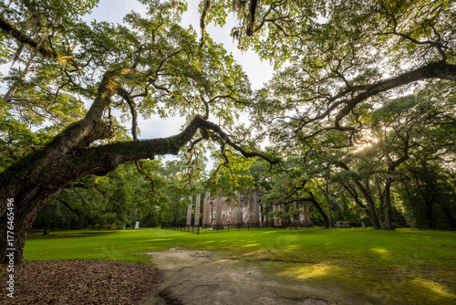 Oak trees surrounding Old Sheldon Church ruins in South Carolina