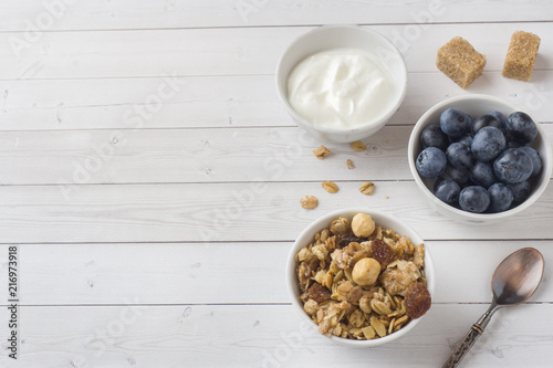 Oat flakes, granules and nuts muesli with blueberries. The concept of healthy food, Breakfast.