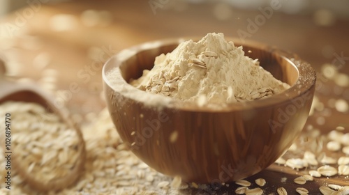 Oat flour pile on wooden bowl gluten free for baking or cooking healthy ingredient