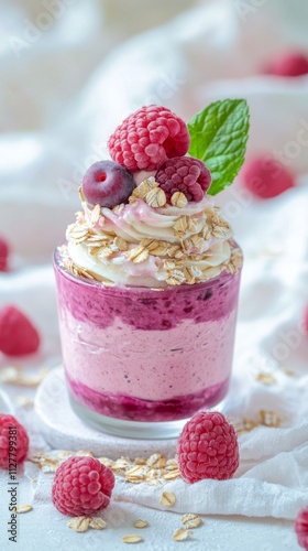 Oatmeal and blueberry whipped cream in a glass jar with fresh raspberries in a white checkered tablecloth background,