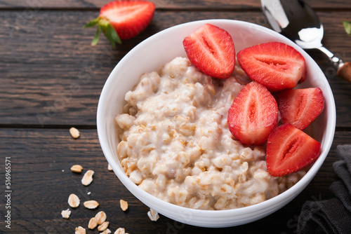 Oatmeal. Bowl of oatmeal porridge with strawberry, almond and milk on old wooden dark table background. Top view in flat lay style. Natural ingredients. Hot and healthy breakfast and diet food.