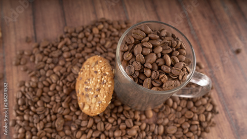 Oatmeal cookies and coffee beans. The concept of morning Breakfast