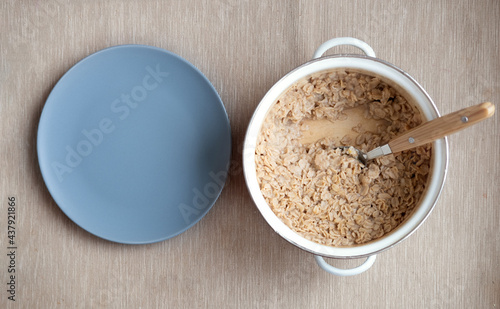 oatmeal in a saucepan with empty plate. Oatmeal breakfast in the morning