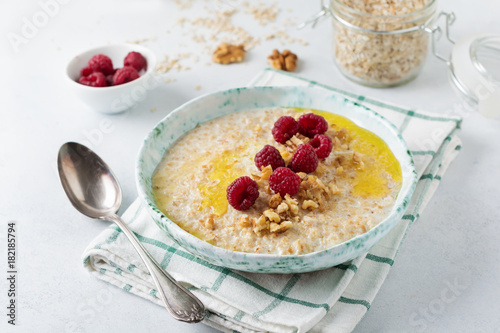 Oatmeal porridge with fresh raspberries, walnuts and butter in a ceramic plate on a light stone or concrete background. Selective focus.