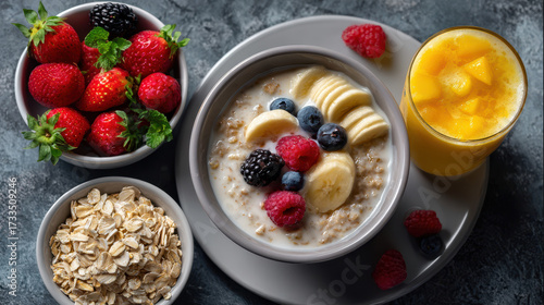 oatmeal, banana, raspberry, blueberry, blackberry, strawberry, orange, juice, breakfast, healthy, bowl, fruit, fresh, cereal, milk, snack, natural, ripe, sweet, alimentary, meal, diet, vitamin, energy, organic, fiber, delicious, morning, refreshment, wholesome, tropical, juicy, colourful, dairy, sliced, raw, food, eating, nourishment