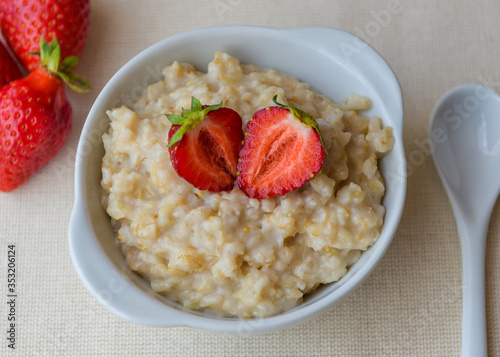 Oatmeal with strawberries in a white bowl. Healthy breakfast, vegetarian lifestyle concept