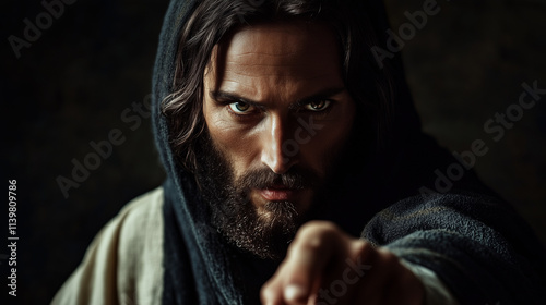 Obraz Jezusa Chrystusa z intensywnym spojrzeniem, gdzie wskazujący palec podkreśla moment przesłania i duchowej wagi.