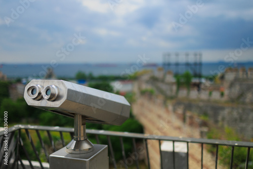 Observation deck and binoculars for viewing the sea and the city of Istanbul in a public place