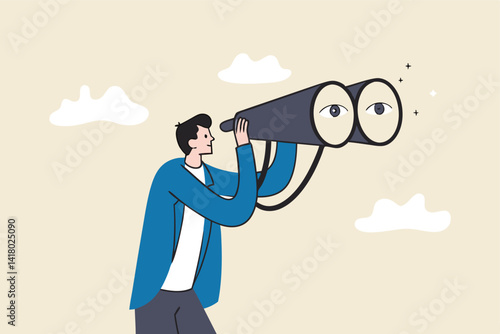 Observation, search for opportunity, curiosity or surveillance, inspect or discover new business, job search or hr finding candidate concept, curious businessman look through binoculars with big eyes.