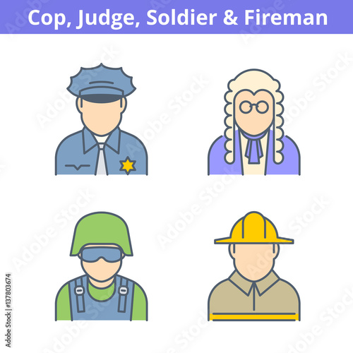 avatar, icon, outline, line, judge, fireman, officer, lawyer, justice, judgement, legal, court, criminal, wig, fire, helmet, firefighter, police officer, cop, guard, police, security, soldier, military, fighter, law, rescue, emergency, protection, hat, safety, face, head, character, man, person, user, set, collection, flat, thin, vector, occupation, profession, professional, job, uniform, linear, colourful, colours