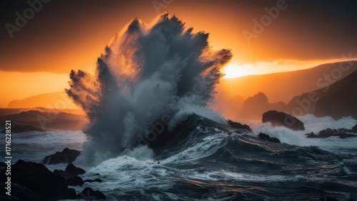 ocean, wave, crashing, coastline, rocky, sunset, sea, water, spray, foam, shore, landscape, nature, horizon, gold, light, sky, cloud, motion, power, energy, storm, wild, erosion, geology, coast, marin, environment, background, travel, scenic, outdoors, weather, breaking, splash, turbulence, dynamic, vibrant, orange, dark