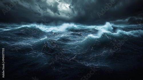 Ocean waves surge with drama beneath dark, ominous clouds.