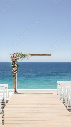 ocean, wedding, arch, floral, ceremony, beach, flower, summer, illustration, romantic, coastal, picturesque, tranquil, beautiful, love, celebration, event, decoration, design, pastel, white, wooden, view, scene, image, background, pretty, elegant, idylli, serene, calm, peaceful, inviting, whimsical, vibrant, bright, sunny, clear, sky, horizon, water, wave, ocean view