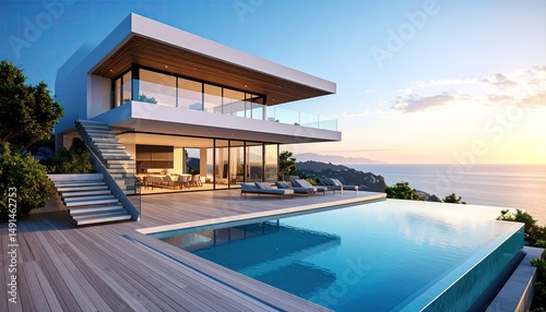 modern architecture, villa, luxury, home, residence, building, ocean view, seaview, sunset, infinity pool, swimming pool, exterior, facades, design, real estate, property, investment, wealthy, affluent, rich, lifestyle, relaxation, vacation, travel, holiday, resort, tour tourism, coastline, contemporary, residential, landscape, deck, terrace, blue skies, clear sky, cloud, daylight, sunlight, step, stair, minimal, clean