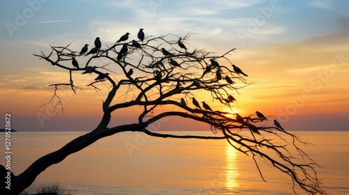 bird, tree, illustration, flock, sky, silhouette, serene, perched, scenic, perch, flight, view, environment, ornithology, scene
