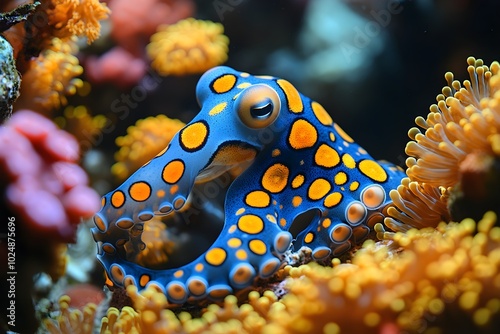 Octopus hiding in a colorful underwater world A colorful octopus hiding among corals and curiously observing its surroundings.