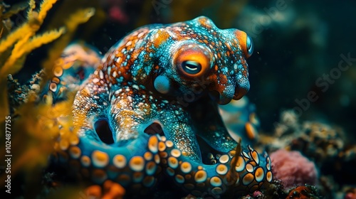 Octopus hiding in a colorful underwater world A colorful octopus hiding among corals and curiously observing its surroundings.