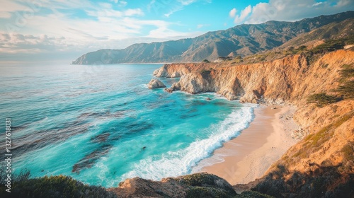 Of a Scenic cliffside beach with soft golden sand and powerful ocean waves crashing against the rocks