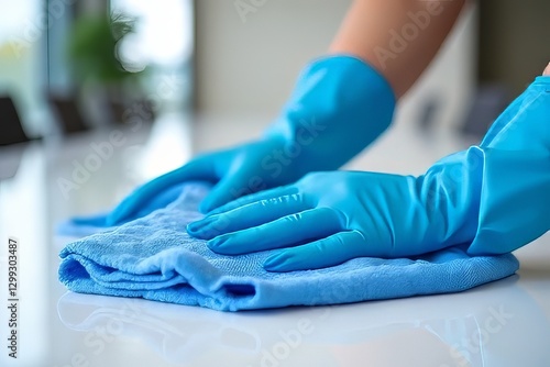 Office Cleaning with Blue Gloves and Microfiber Cloth