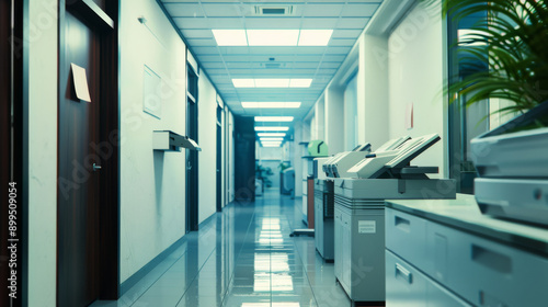 office, corridor, printer, functional, workspace, modern, organised, clean, professional, corporate, productivity, efficient, interior, hallway, equipment, tech, business, sleek, structured, bright, neat, furniture, lighting, technology, work area, orderly, minimalist, commercial, practical, organisation