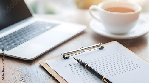 Office desk setup with laptop, clipboard and coffee cup for productivity blog post, online course promo or freelance work website header. Selective focus