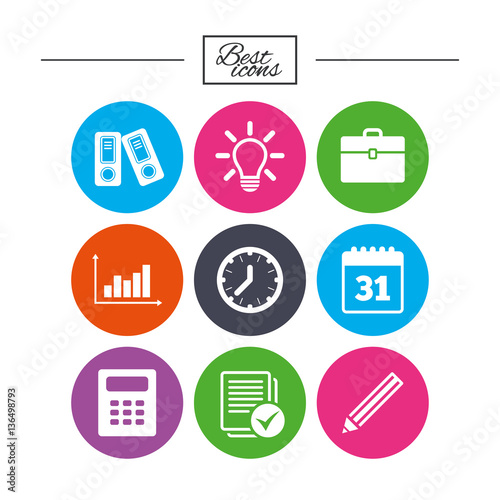 office, business, crayons, case, chart, diplomat, idea, lamp, arrow, analysis, calendar, clock, watch, time, calculating machine, file, page, check, tick, accounting, folder, select, circle, light, document, device, memo, column, icon, flat, signs, symbol, vector, simple, best, round, buttons, clean, classic, design, graphic, art