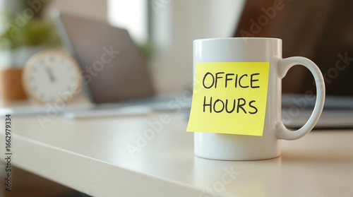 Office hours reminder on coffee mug with sticky note for business and work schedule