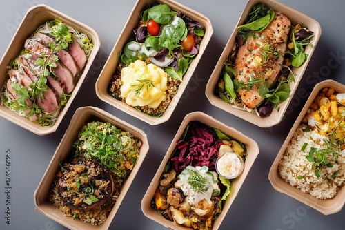 office lunch delivery set, variety of fresh healthy meals in eco boxes, top view, clean composition