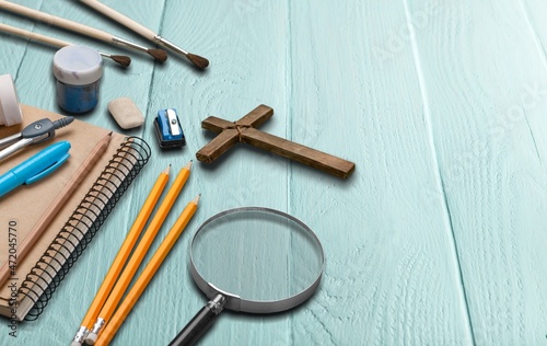 christian, back to school, background, background, blue, blue background, calculating machine, catholic, catholicism, christianity, class, classroom, concept, copy space, cross, cross, education, eraser, faith, glue, grow, hope, jesus christ, learn, modern, nobody, office