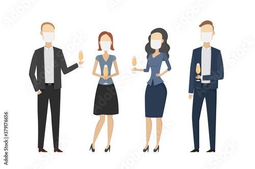 office, people, face mask, party, corporate, employee, pandemic, champaign, drink, alcohol, colleague, office worker, staff, white-collar, manager, man, woman, faceless, celebrate, celebration, quarantine, epidemic, mask, cartoon, vector, illustration, team