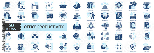 OFFICE PRODUCTIVITY icon set two color style with document, team, organization, teamwork, office, presentation, interview, archive, employee, productivity, skill, professional icons