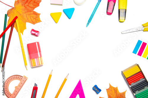 Office supplies layout on a white background copy space . School supplies. Colored stationery. Isolated background. Article about preparing for the school year. Copy space