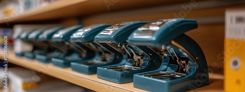 Office supplies staplers in a store product display retail environment close-up view stationery organization