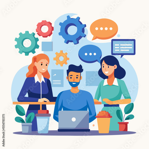 Office team gathered around meeting table brainstorming ideas, sharing strategies, and planning business tasks in a collaborative professional work environment