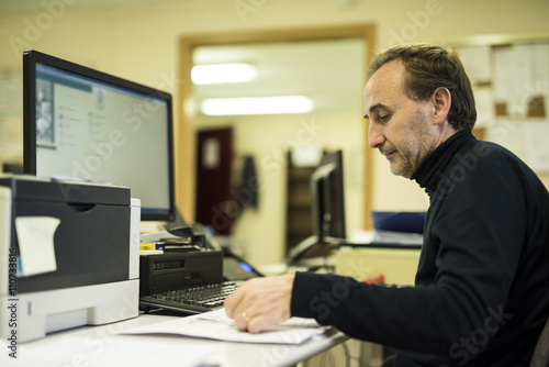 man, office, looking down, computer, adult, sitting, men at work, table, desk, document, at work, workplace, horizontal, indoor, calm, screen, 1, person, half face, profession, professional, working, real people, realistic, printer, technology