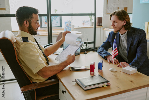 interview, office, immigration, applicant, check, document, paperwork, discussion, interaction, bureaucracy, conversation, professional, workplace, consultation, desk, person, us, american, flag, work, job, government, administrative, processing, meeting, official, career, posing, to sit, senior, communication, application, clipboard, form, serious, man