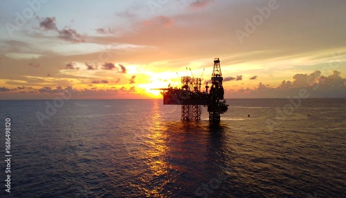 sunset, ocean, rig, oil, platform, industry, energy, silhouette, dramatic, water, horizon, cloud, sky, gold, dark, aerial, view, ship, tower, large, powerful, industrial, bright, cloudscape, calm, sea, vessel, equipment
