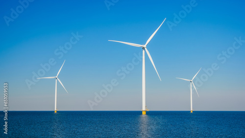 offshore windmill park with clouds and a blue sky, wind mill turbines in the Netherlands