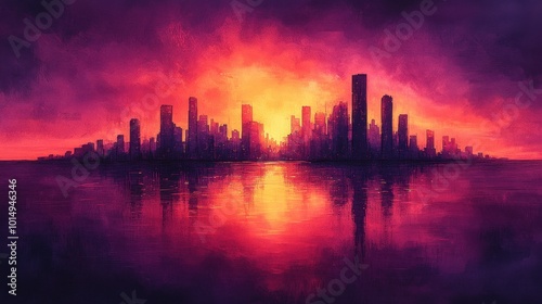 Oil ink abstract city skyline at dusk with bold strokes of deep purple and orange positioned from a wide zoomed-out angle to capture the city’s silhouette and its reflection