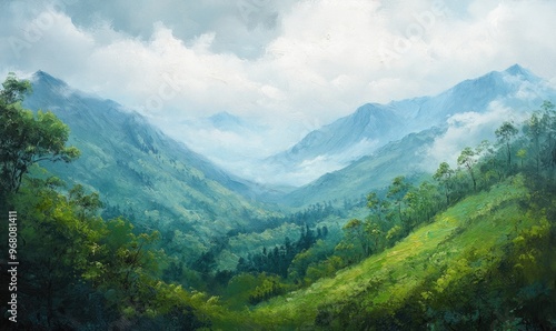 Oil painting depicting a mountain landscape with lush greenery and serene nature scenes