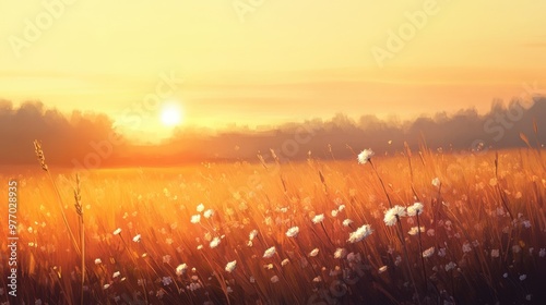 Oil painting depicting a stunning panoramic countryside landscape with blooming wild grasses at sunset showcasing a warm summer atmosphere and a focus on the foreground
