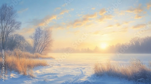 Oil painting depicting a winter morning with a foggy sky creating a serene and beautiful atmosphere