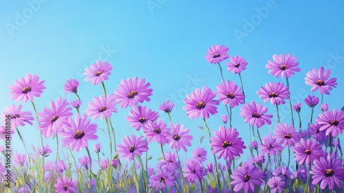 Oil painting of vibrant purple daisy flowers against a clear blue sky showcasing the beauty and freshness of a wildflower field in spring time