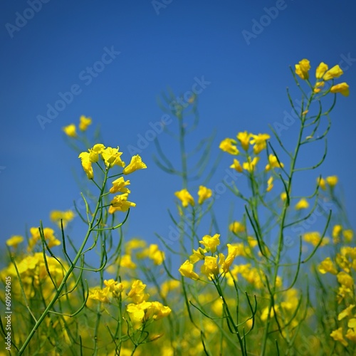 Oilseed rape. A field with a popular crop. Beautiful Czech landscape with yellow plant and blue sky. (Brassica napus)