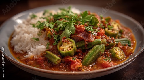 okra, stew, rice, vegetarian, tomatoes, food, dish, meal, cookery, healthy, fresh, delicious, epicure, vegetable, cooked, cilantro, herb, dinner, lunch, nourishment, diet, ingredient, bowl, plate, tasty, homemade, culinary, receipe, vegan, organic, wholesome, savoury, spice, presentation, closeup, rustic, still life, food photography
