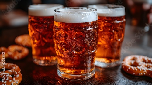 Oktoberfest celebration in Munich with people enjoying traditional beer and pretzels in a festive outdoor setting