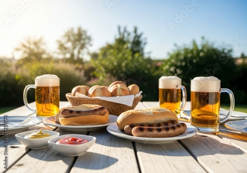 Oktoberfest Refreshing beer mugs and hot dogs served with bread rolls and condiments on a wooden table outdoors