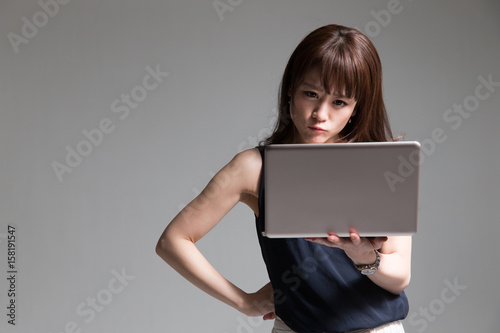 woman, people, youth, young, japanese, alone, pretty, 30s, face, ol, business, working girl, temp, work, employee, portrait, white background, cut-out, beauty, casual, career woman, indoor, indoor, personal computer, notebook, laptop, personal computer, cyberspace, dark, contrast, cool, cool, tight, bright, contemplate, trouble, unrest, apprehension