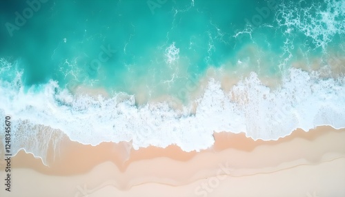 Olas turquesas del océano rompiendo en una playa de arena, con una clara distinción entre el agua y la orilla. El agua parece espumosa y dinámica, mostrando varios tonos de azul y blanco