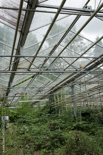Old abandoned overgrown green house building with growing green vines covering glass panels and walls
